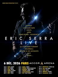 -Dates de la tournée : Eric Serra Live 19/11/26 – Caen · Zénith 20/11/26 – Brest · Arena 21/11/26 – Nantes · Zénith 22/11/26 – Poitiers · Arena Futuroscope 24/11/26 – Bordeaux · Arkéa Arena 25/11/26 – Toulouse · Zénith 27/11/26 – Aix-en-Provence · Arena 28/11/26 – Nice · Palais Nikaia 29/11/26 – Montpellier · Zénith Sud 02/12/26 – Lyon · LDLC Arena 03/12/26 – Reims · Arena 04/12/26 – Amnéville · Galaxie 05/12/26 – Strasbourg · Zénith 06/12/26 – Paris · Accor Arena (final exceptionnel)