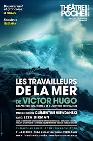 Un amas d’escabeaux et de planches encombre la partie cour du plateau, quelques lumières, un ventilateur. Ce sera le bateau. Partie gauche du plateau, un homme, un pêcheur, rustre tout autant que sensible. On le moque parce qu’il est différent : « que voulez-vous que le pays devienne avec un homme comme cela », murmure-t-on. Il s’appelle Gilliatt. A 30 ans, il en parait 45. Nous sommes à Guernesey, petit ile anglo-normande, domicile du pêcheur mais aussi refuge de Victor Hugo, l’auteur de ces « travailleurs de la mer », pavé de 700 pages dont Elya Birman et Clémentine Niewdanski proposent ici une adaptation théâtrale en une heure. Gilliatt, en dehors de la mer, nourrit une passion secrète pour Déruchette, la fille d’un armateur, propriétaire de la Durande, un vapeur qui vient de s’échouer au large de Guernesey. Le navire est détruit mais pas sa précieuse et irremplaçable chaudière. Alors, comme un défi, la jeune Déruchette offre le mariage à quiconque sauvera des flots ce qui reste du navire. C’en est trop pour Gilliatt. Fort de cette promesse qu’il tient pour acquise, il va se lancer dans plusieurs mois d’un labeur inhumain, sous les intempéries et au péril de sa vie. Arrivera-t-il à ses fins ? Rapportera-t-il sa précieuse cargaison ? Remportera-t-il la main de Déruchette ? On ne dévoilera pas ici la conclusion de ce récit lyrique dont le style flatte l’oreille tout autant qu’il empèse parfois les phrases. Avec son corps, dur à la tâche, avec les mots de Hugo, Elya Birman nous propose un Gilliatt impeccable. On est avec lui, on souffre avec lui. Le comédien et Clémentine Neiwdanski, la coadaptatrice et metteuse en scène, proposent ici un récit classique, respectueux de la magnifique langue de l’auteur des Misérables. Et le public du Poche Montparnasse, adepte de la littérature des siècles passés, y trouve son compte et exprime -avec raison- sa jubilation devant cette adaptation. Le critique qui signe ces lignes a lui aussi apprécié la performance mais il doit reconnaitre, avec regret, avoir été peu sensible à ce qui se passe sur le plateau du théâtre de Poche.
