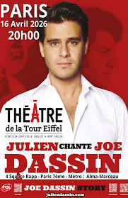 Julien Dassin présente Joe Dassin Story à Paris, le 16 avril 2026 au Théâtre de la Tour Eiffel. Après avoir triomphé dans plus de 25 pays, de l’Europe au Canada jusqu’aux États-Unis, Julien Dassin offre au public parisien une représentation exceptionnelle de son spectacle Joe Dassin Story au Théâtre de la Tour Eiffel. Julien Dassin, fils de la légende Joe Dassin, perpétue l'héritage musical familial à travers une tournée mondiale triomphale intitulée "JOE DASSIN Story". Bien plus qu'un simple concert hommage, Julien Dassin propose une immersion totale dans l'univers de son père. Accompagné par ses musiciens du Paris Tour Eiffel Band, il interprète en direct et avec une fidélité respectueuse tous les plus grands succès intemporels de Joe Dassin, tels que L'Été indien, L'Amérique, ou encore À toi. La particularité de ce show réside dans l'intégration de rares images d'archives et de vidéos inédites, offrant un pont poignant entre le passé et le présent. La tournée continue de captiver et de susciter l'émotion partout où elle passe, promettant une soirée unique de célébration et de nostalgie. Le spectacle revient régulièrement en France et en Belgique pour des dates événement. Ne manquez pas cette expérience romantique et dynamique dédiée à l'icône de la chanson française. Venez profiter d'une soirée unique, entre émotion et célébration le jeudi 16 Avril 2026 à 20h00 au Théâtre de la Tour Eiffel à Paris, et en tournée dans toute la France.